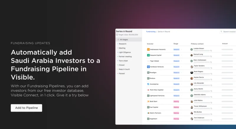 - Find investors at the top of your funnel with our free investor database, Visible Connect and find a filtered list of investors.