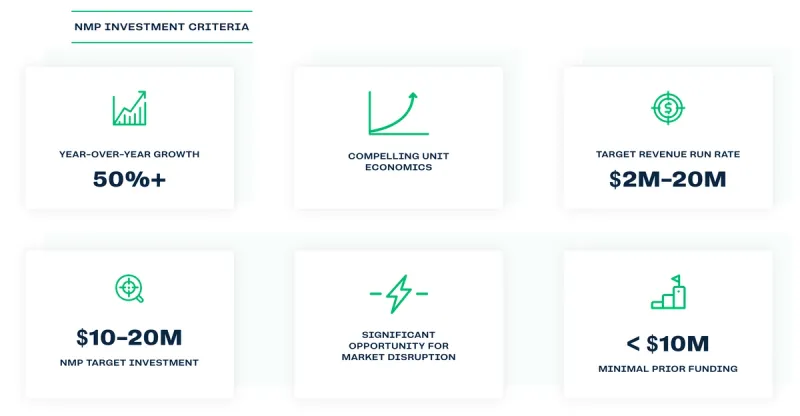 Funding stage: NMP typically looks for companies with a $2M-20M run rate and will write checks between $10M and $20M.