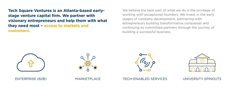 As put by their team, “Tech Square Ventures is an Atlanta-based early-stage venture capital firm. We partner with visionary entrepreneurs and help them with what they need most – access to markets and customers.”
