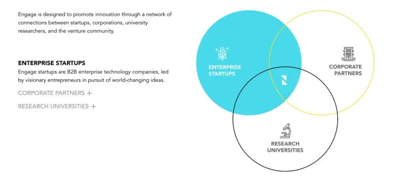 According to their team, “Engage is an enterprise venture platform that counts 11 of the country’s largest corporations as investors. We invest in enterprise and frontier technology informed by insights from our corporate partners.”