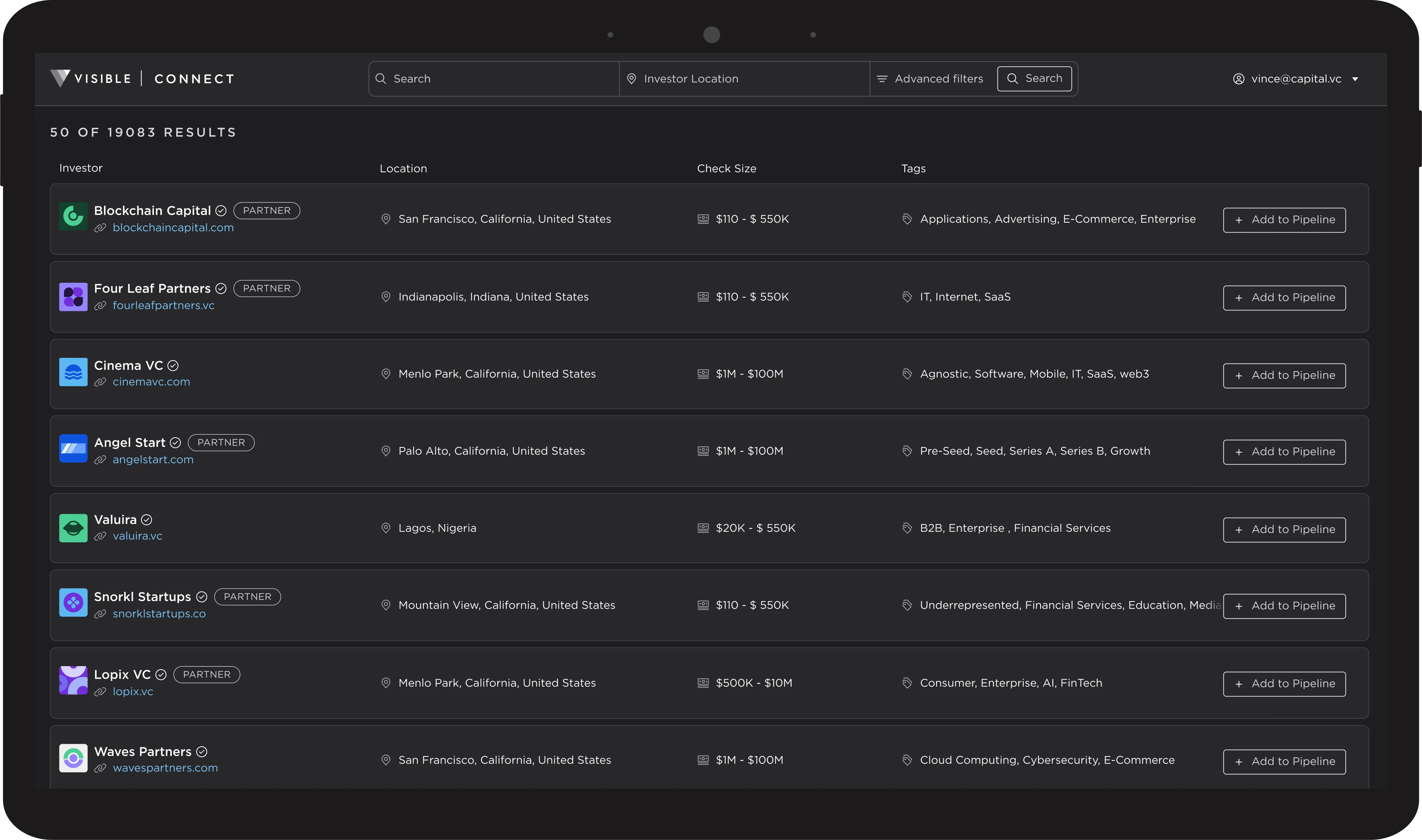 Visible Connect is our curated database of over 19,000 venture funds with robust filtering and CRM integration to cut through the noise and get to meaningful conversations faster.