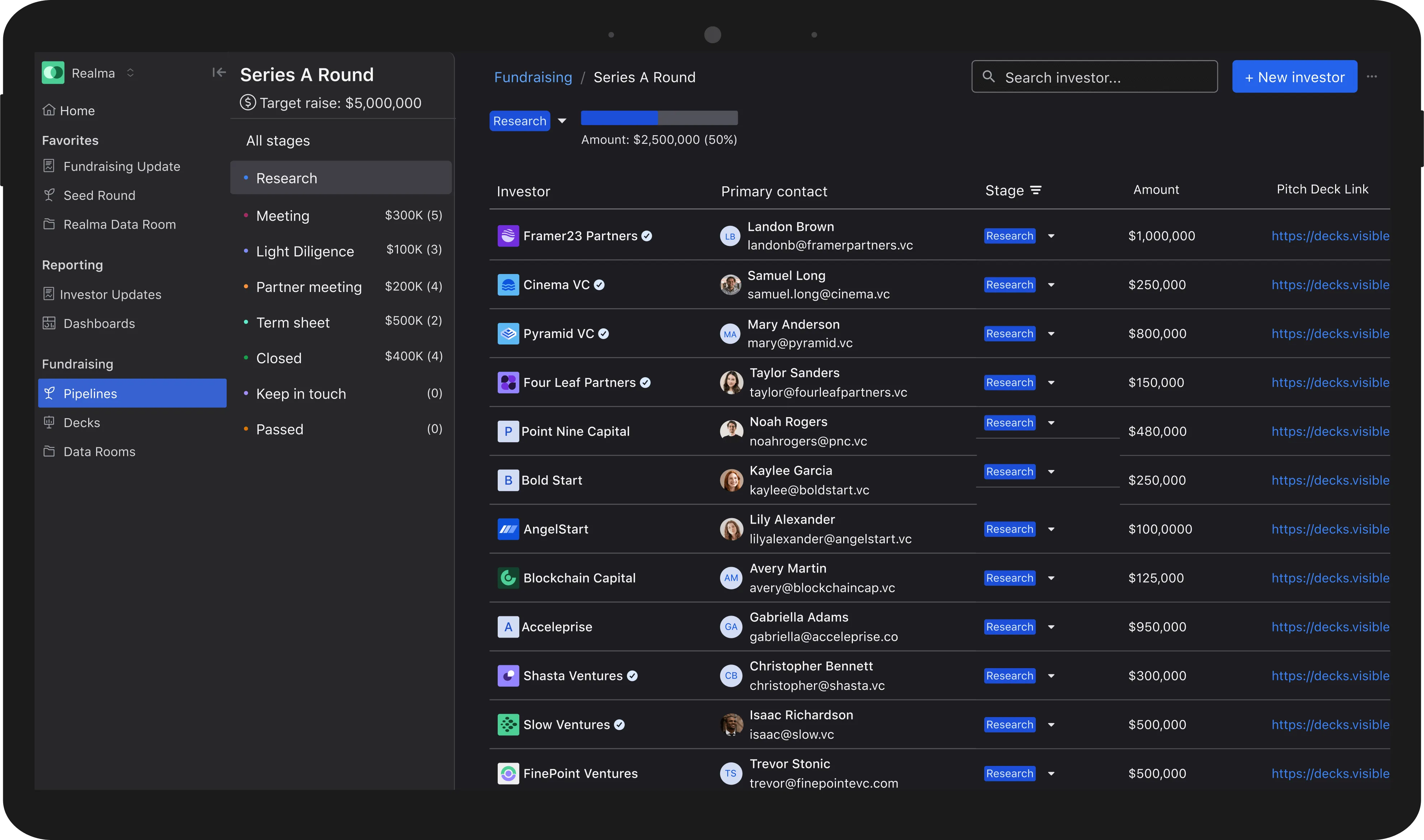 Add investors to your fundraising pipeline to track conversations and engagement with potential investors.