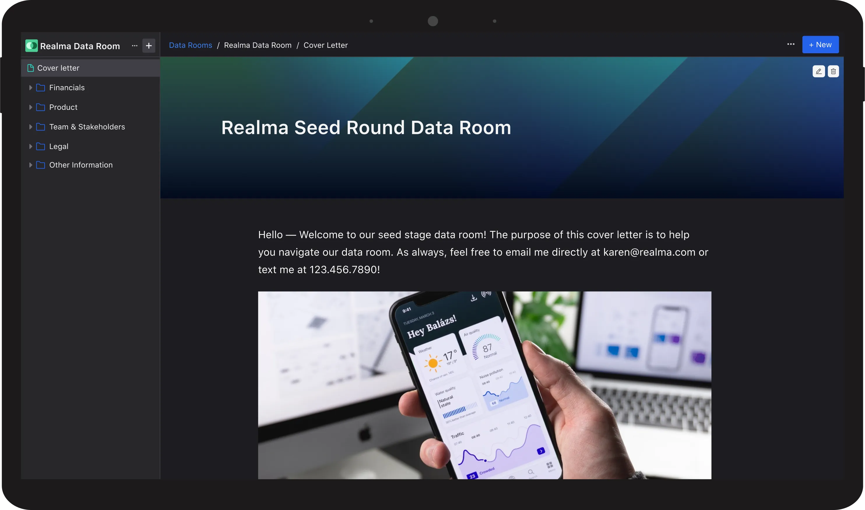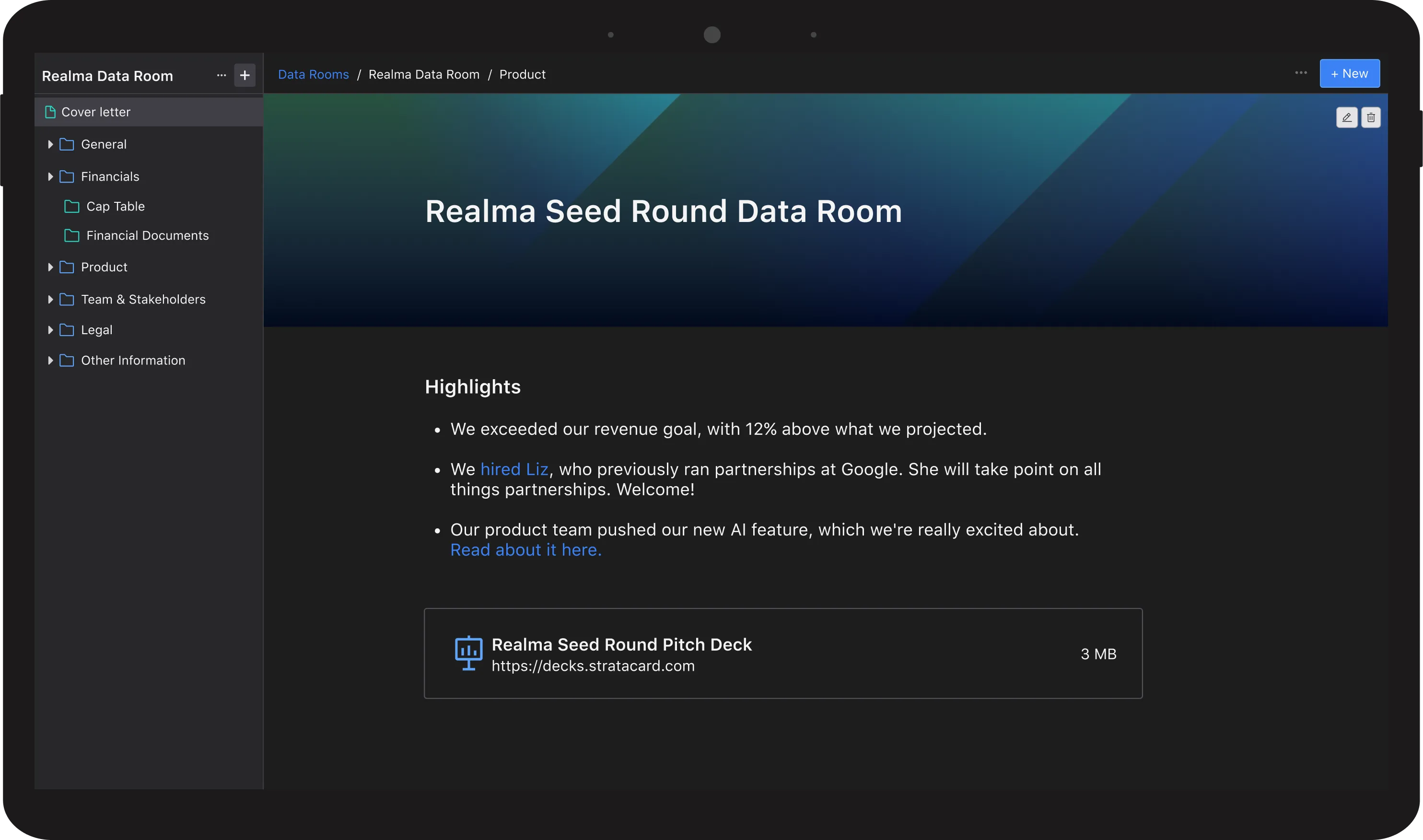 Securely create, update, and share your data room to keep momentum in your fundraising process.