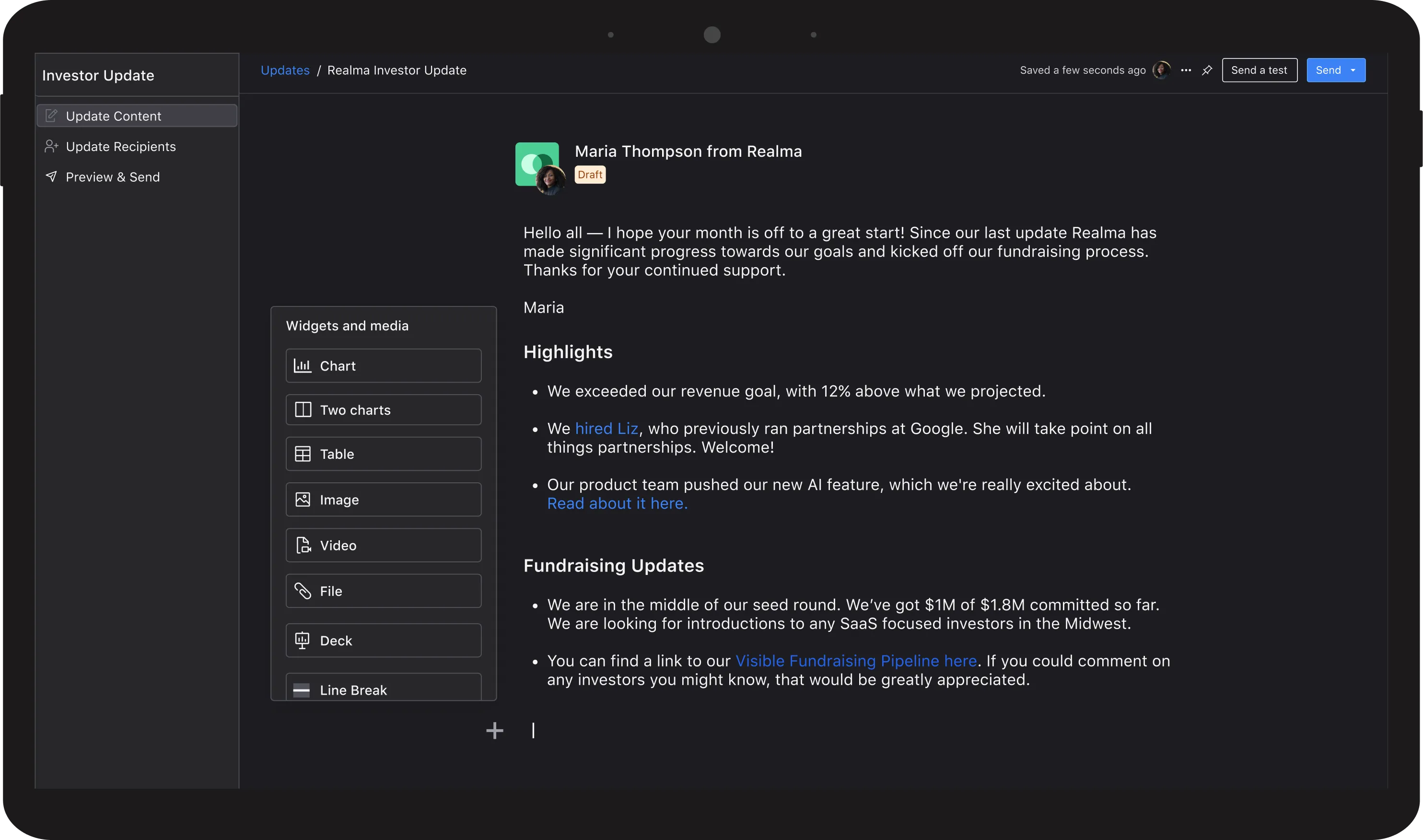 Build beautiful updates that can be shared via email, link, PDF, or Slack.