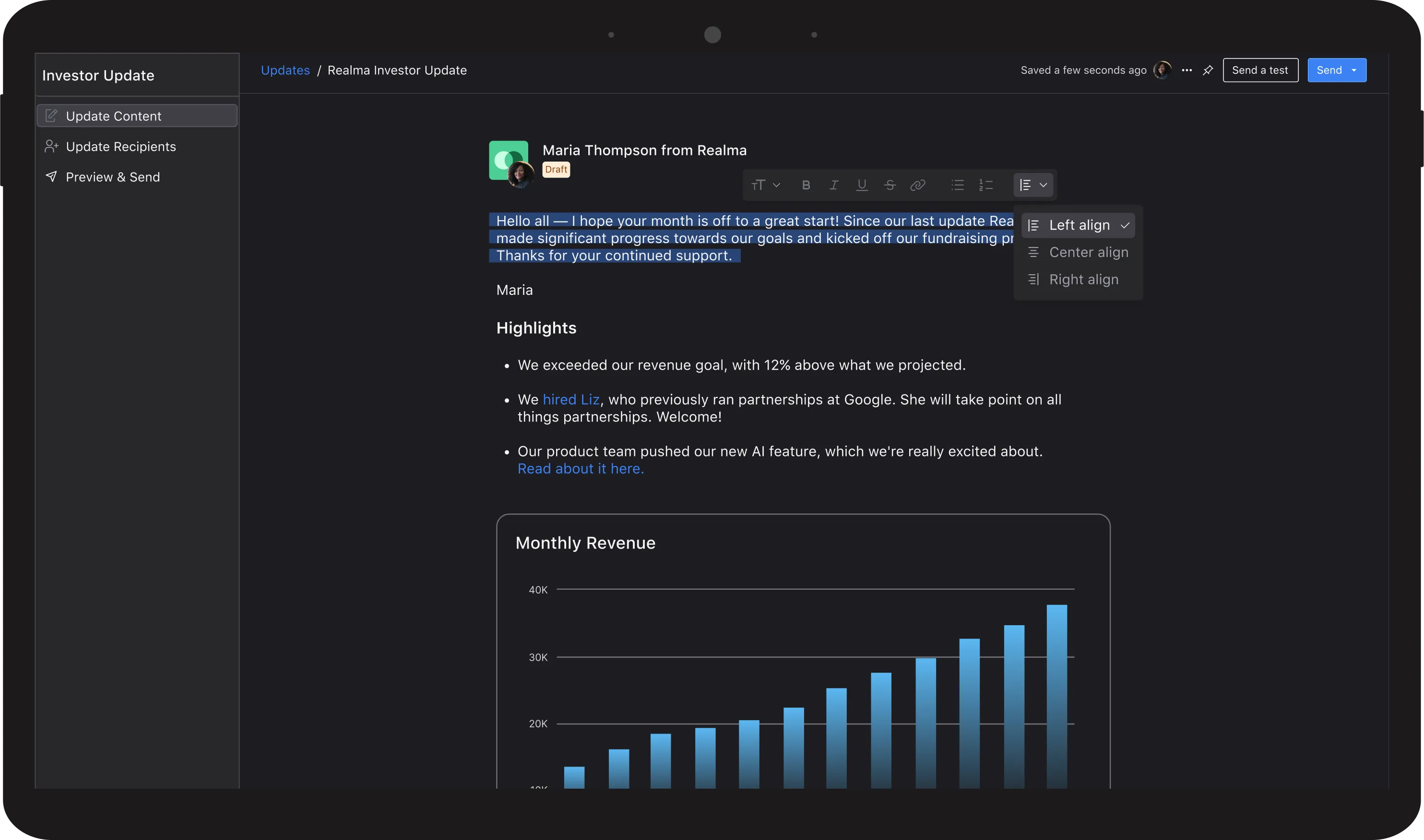 Use our rich text editor to build professional updates.