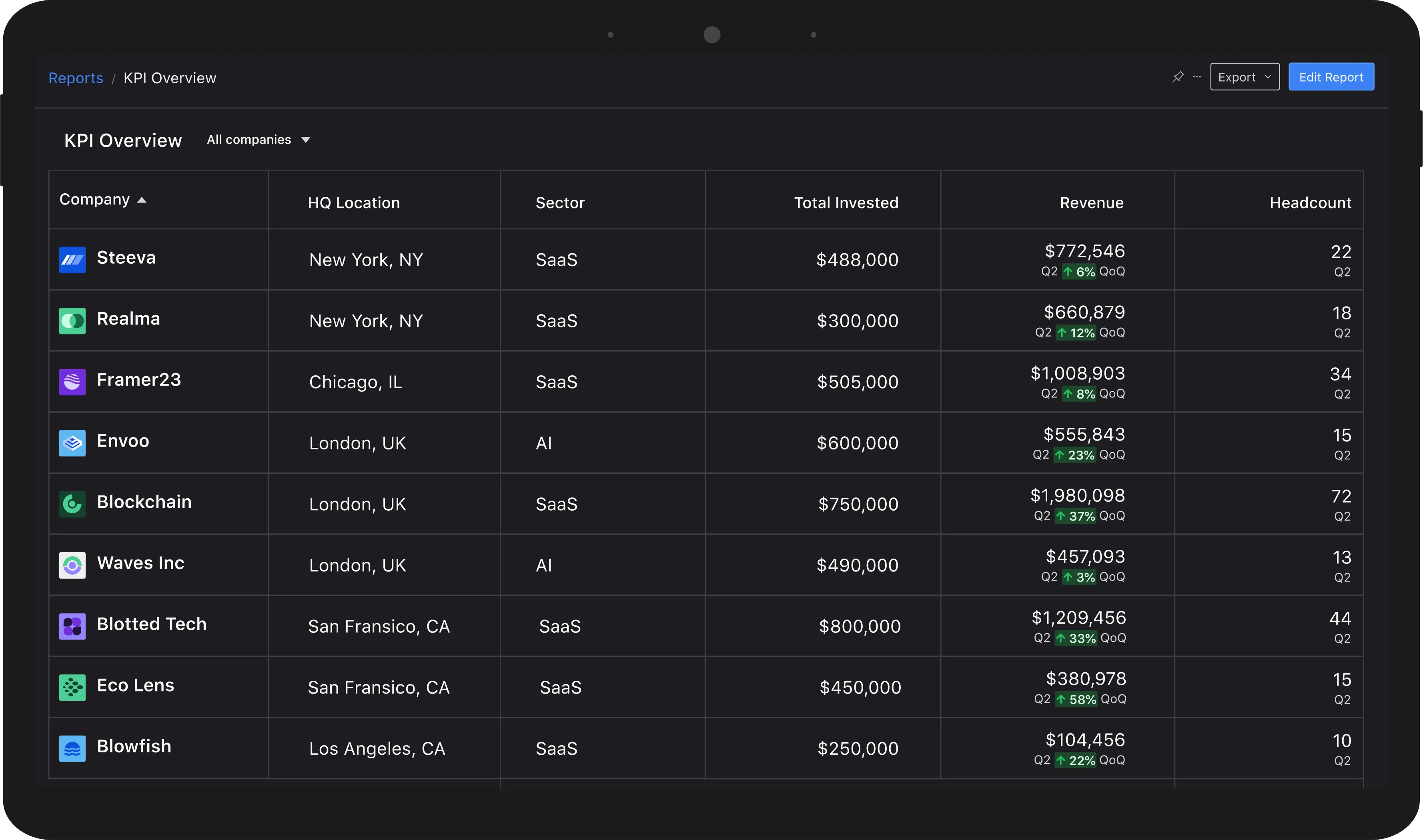 "I can't praise the Visible team enough! We can push financial requests to our portfolio companies, directly access metrics & responses in the platform, and analyze our data to compare individual & portfolio-wide performance through dashboards."